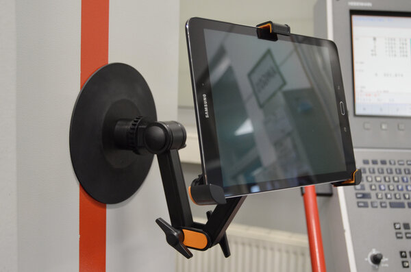 Halterung für ein Tablet an unserem Saugnapf-Magnetsystem - direkt am Maschinengehäuse.